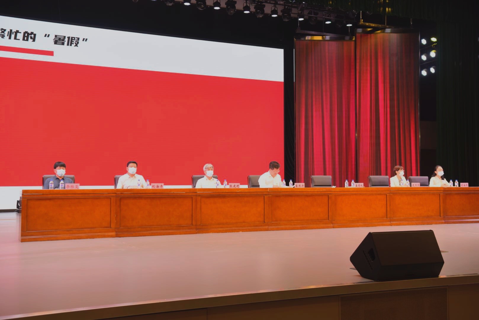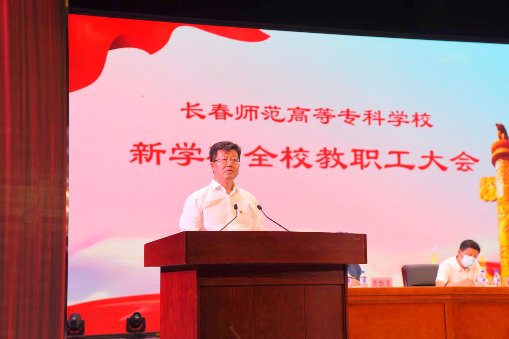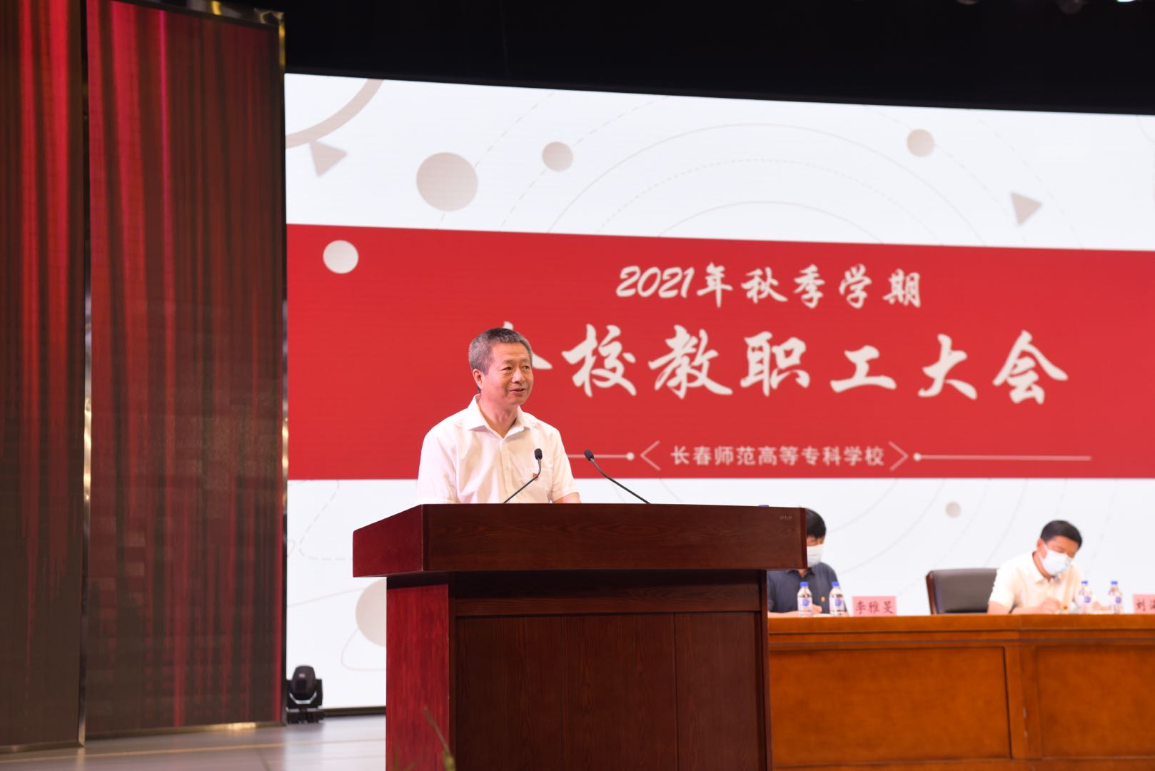 2021年8月24日上午,我校在艺术中心召开秋季学期全校教职工大会。校党委书记崔国涛,党委副书记、校长姜国权,党委委员、纪委书记张建村,党委委员、副校长史书华,党委委员、副校长刘海涛及全校教职工出席会议。会议由崔国涛主持。