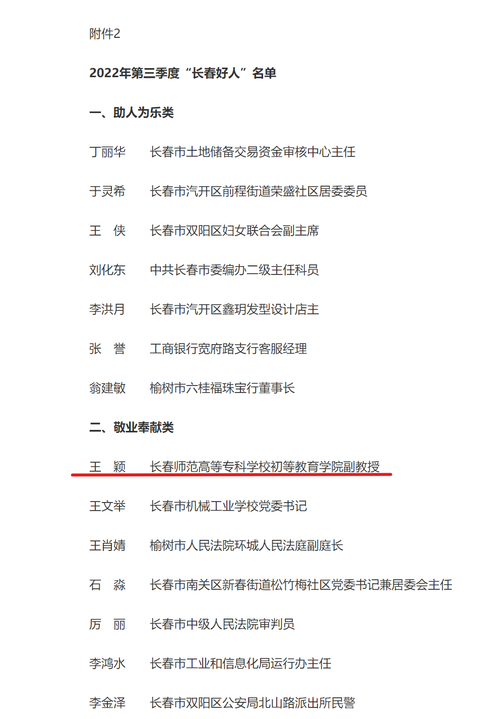 近日,由长春市委宣传部、市文明办、市总工会、团市委、市妇联等部门联合组织开展的“长春好人”推荐评选活动结果揭晓。经个人申报、基层单位推荐、群众网络投票、评审委员会评定等程序,我校初等教育学院王颖老师荣获2022年第三季度“长春好人”荣誉称号。