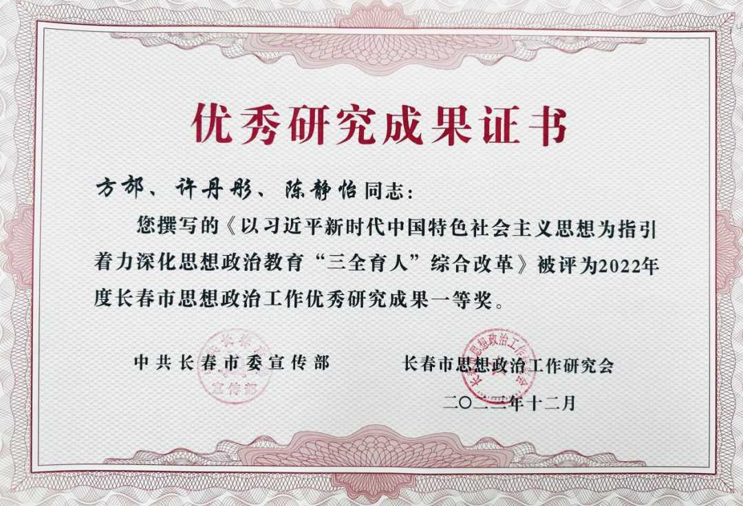 近日,中共长春市委宣传部、长春市思想政治工作研究会联合下发了《关于表彰2022年度长春市思想政治工作优秀研究单位和优秀研究成果的决定》,公布了长春市2022年度思想政治工作优秀研究单位和优秀研究成果的评选结果,共有35个单位获评优秀研究单位,150篇研究成果获评优秀研究成果。我校报送的作品获得一等奖1项,三等奖2项,学校获得2022年度长春市思想政治工作优秀研究单位荣誉称号。