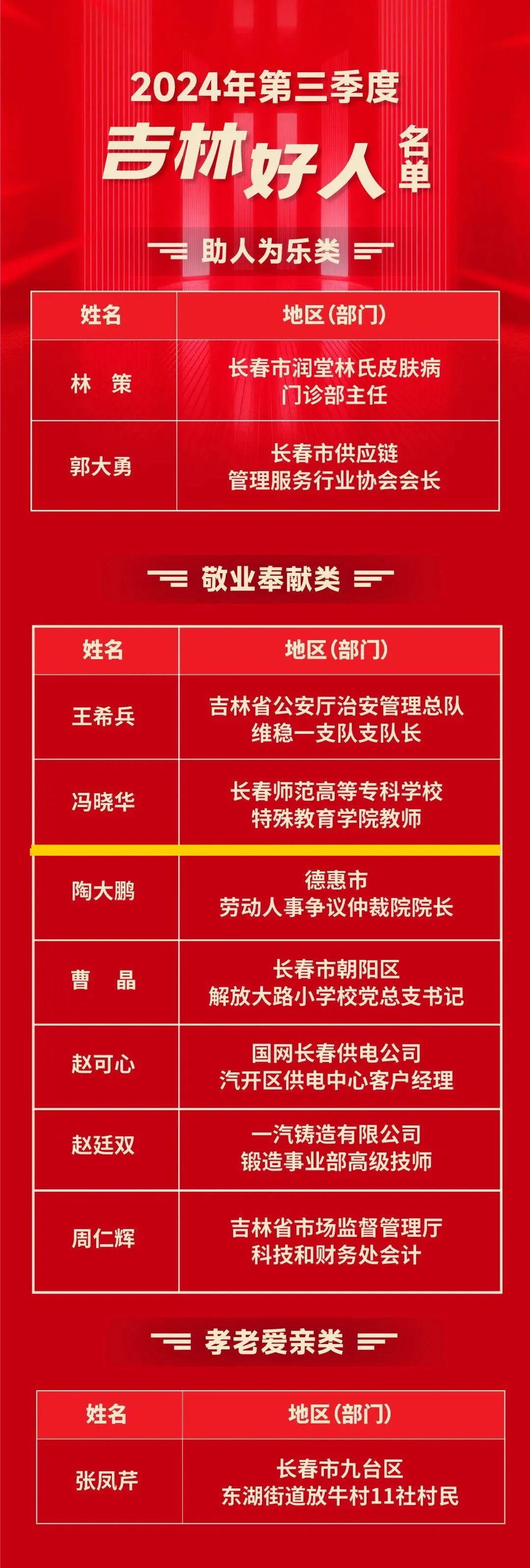 近日,中共吉林省委宣传部揭晓2024年第三季度“吉林好人”名单,我校特殊教育学院冯晓华老师获评敬业奉献类“吉林好人” 荣誉称号。