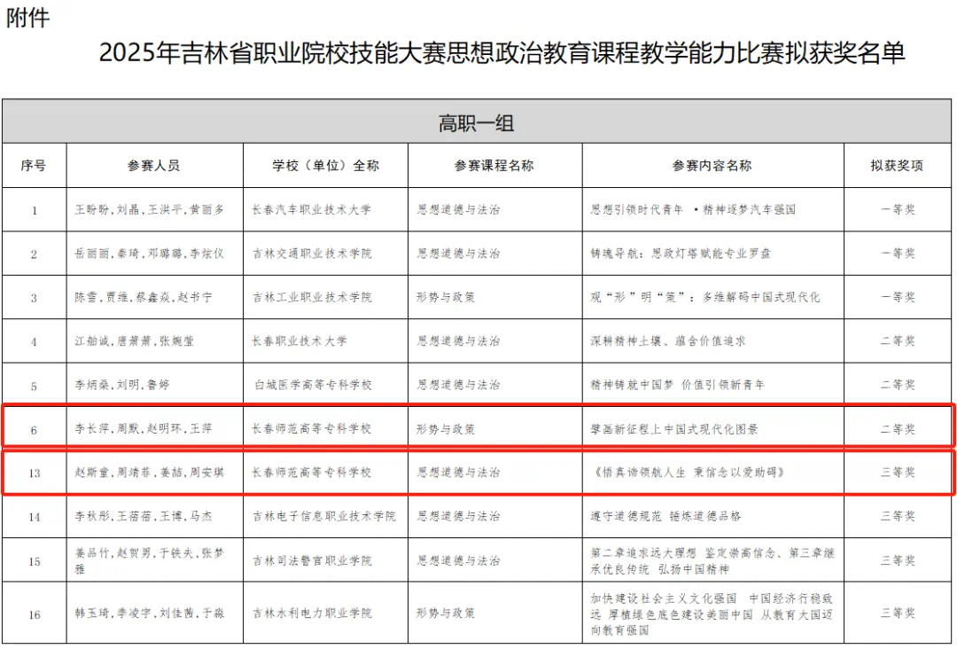 近日,吉林省教育厅公示了2025年吉林省职业院校技能大赛思想政治教育课程教学能力比赛拟获奖名单,我校马克思主义学院两支教师队伍斩获佳绩。李长萍、周默、赵明环、王萍老师凭借《擘画新征程上中国式现代化图景》斩获二等奖;赵斯童、周靖菲、姜喆、周安琪老师以《悟真谛领航人生 秉信念以爱助碍》荣获三等奖。