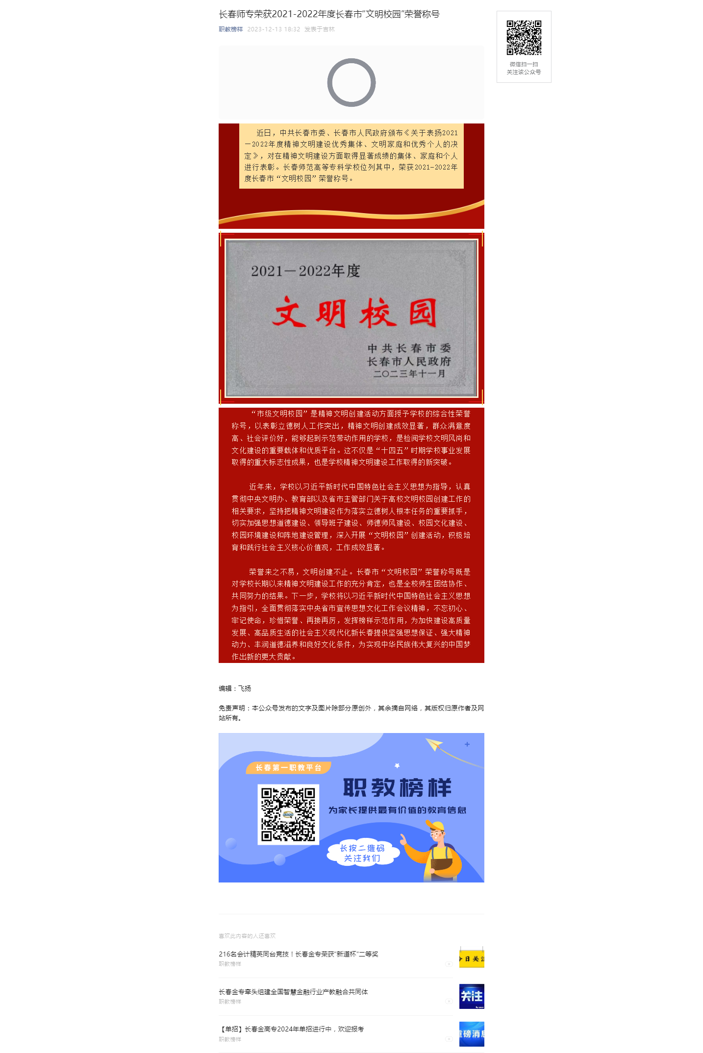 长春师专荣获2021-2022年度长春市“文明校园”荣誉称号-国产一区二区日本在线-Changchun Normal College-官方网站